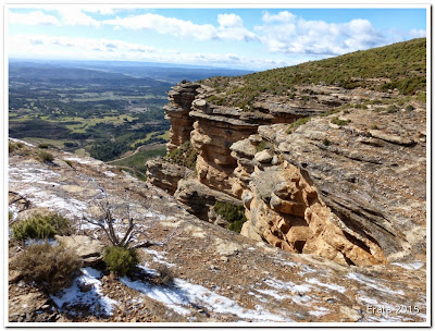La previsión para el domingo era mejor, pero al levantarnos seguía nevando un poco y además con fuerte viento, así que nos volvimos a la cama en lugar de ir a esquiar. Hicimos bien, Formigal cerrado por viento y Panticosa con cadenas... Al final decidimos irnos a hacer alguna excursión por cotas más bajas y soleadas y nos fuimos hacia Huesca donde la cara Sur de la sierras pre-pirenaicas estaban bastante limpias de nieve. Desde allí nos fuimos hacia Ayerbe ya con la idea clara de ir a visitar el Mirador de los Buitres en donde ya habíamos estado hace unos años.